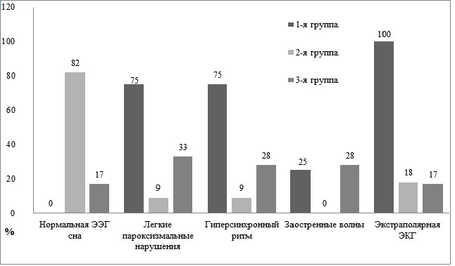 При визуальной оценке ЭЭГ отсутствие патологических изменений чаще отмечалось у пациентов 2-й группы (n=9) в сравнении с 1-й (n=0, Fisher-0,011) и 3-й (n=3, Fisher-0,001) группами (рис. 1). Легкие пароксизмальные нарушения в виде высокоамплитудных билатеральных вспышек мономорфных тета-волн 4–6 Гц в лобных и затылочных отведениях в 1–2 стадиях сна чаще регистрировались в 1-й группе (n=3) в сравнении со 2-ой группой (n=1, Fisher-0,032), статистически значимых различий между 1-й и 3-й (n=6, Fisher-0,149) группами получено не было. Гиперсинхронный ритм также чаще выявлялся у пациентов 1-й группы (n=3) по сравнению со 2-й (n=1, Fisher-0,032). Статистически значимых различий между 2-й и 3-й (n=5, Fisher-0,924) и 1-й и 3-й (Fisher-0,107) группами по частоте регистрации гиперсинхронного ритма не выявлено. Потенциалы экстрацеребрального происхождения (экстраполярная ЭКГ) регистрировались у всех пациентов 1-й группы (n=4) в сравнении со 2-й (n=2, Fisher-0,011) и 3-й (n=3, Fisher-0,005) группами. При анализе других изменений ЭЭГ (заостренные волны в составе нормальных ритмов, характеризующие снижение порога судорожной готовности головного мозга) статистически значимых различий между группами не получено.