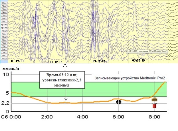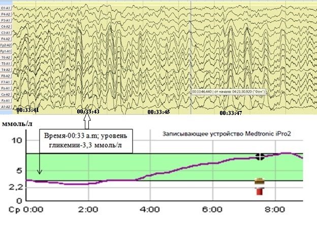Проведенное бифункциональное мониторирование гликемии и ЭЭГ позволило выявить взаимосвязь уровня гликемии и изменений на ЭЭГ.