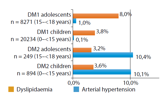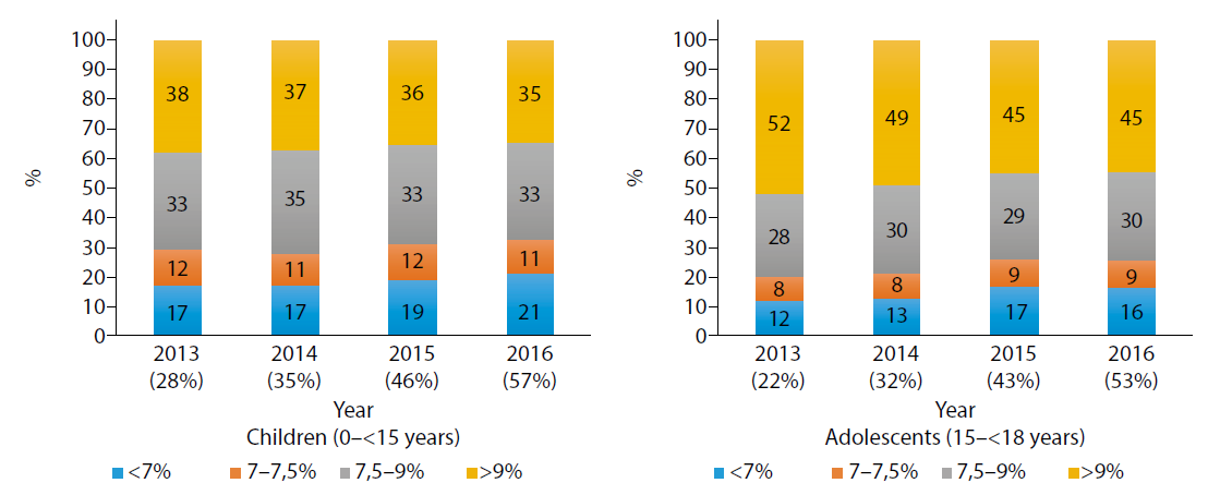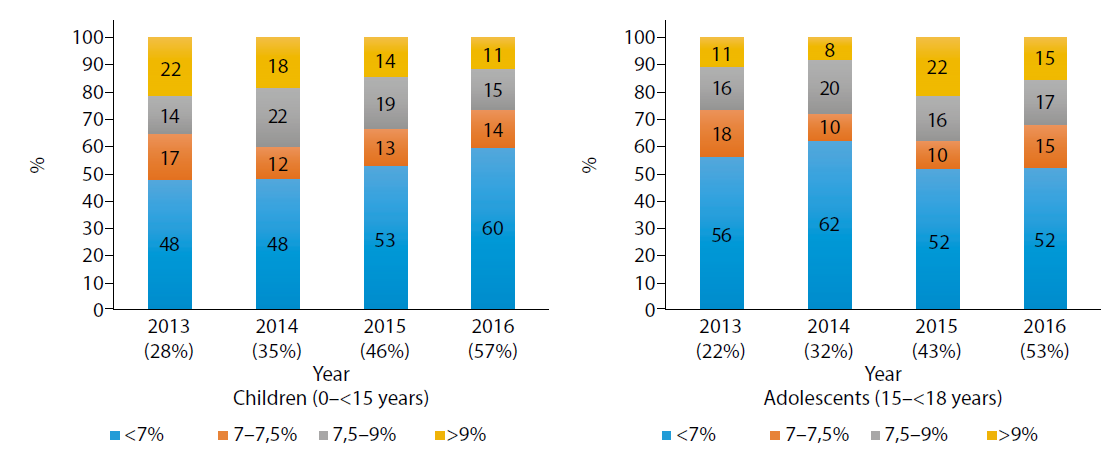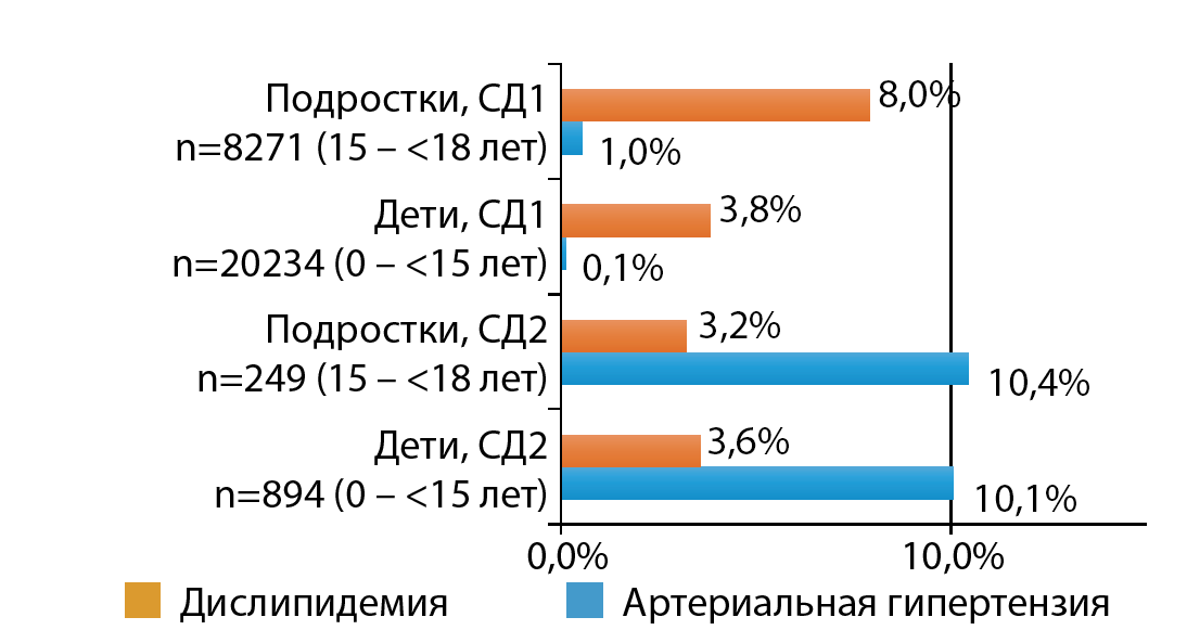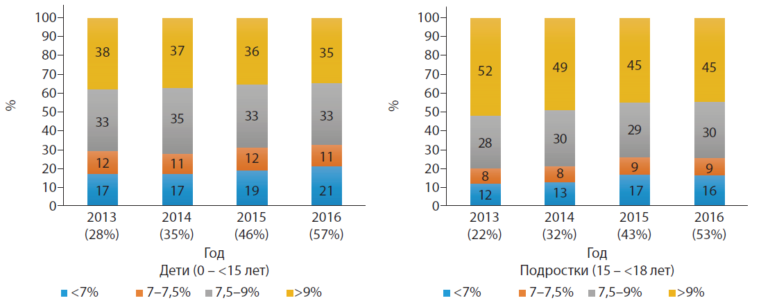 Результаты. Общая численность пациентов с СД до 18 лет в РФ на 31.12.2016 г. составила 33 081 человек, из них с СД 1 типа (СД1) – 95,9% (31 727 чел.) и СД 2 типа (СД2) – 4,1% (1354 чел.). Распространенность СД1 в 2013–2016 гг. у детей составила 81,0–91,4/100 тыс. детского населения (д.н.), у подростков – 212,8–209,5/100 тыс. подросткового населения (п.н.). Заболеваемость СД1 у детей в 2016 г. составила 14,2/100 тыс. д.н., у подростков – 10,0/100 тыс. п.н. Распределение по уровню HbA1c у пациентов с СД1 в 2016 г: дети: <7,5% – 32%, 7,6–9,0% – 33%, >9% – 35%; подростки: <7,5% – 25%, 7,6–9,0% – 30%, >9% – 45%. Среди осложнений у детей и подростков наиболее часто регистрируется диабетическая нейропатия при СД1 в 10,9% и 40,8% случаев, при СД2 – в 4,7% и 8,8% соответственно, из сопутствующих заболеваний – артериальная гипертония и дислипидемия. Госпитализировались в анамнезе 43,8% детей и 49,2% подростков, большинство госпитализаций в 2016 г. (дети 71,9%, подростки 67,1%) было по причине СД.