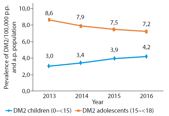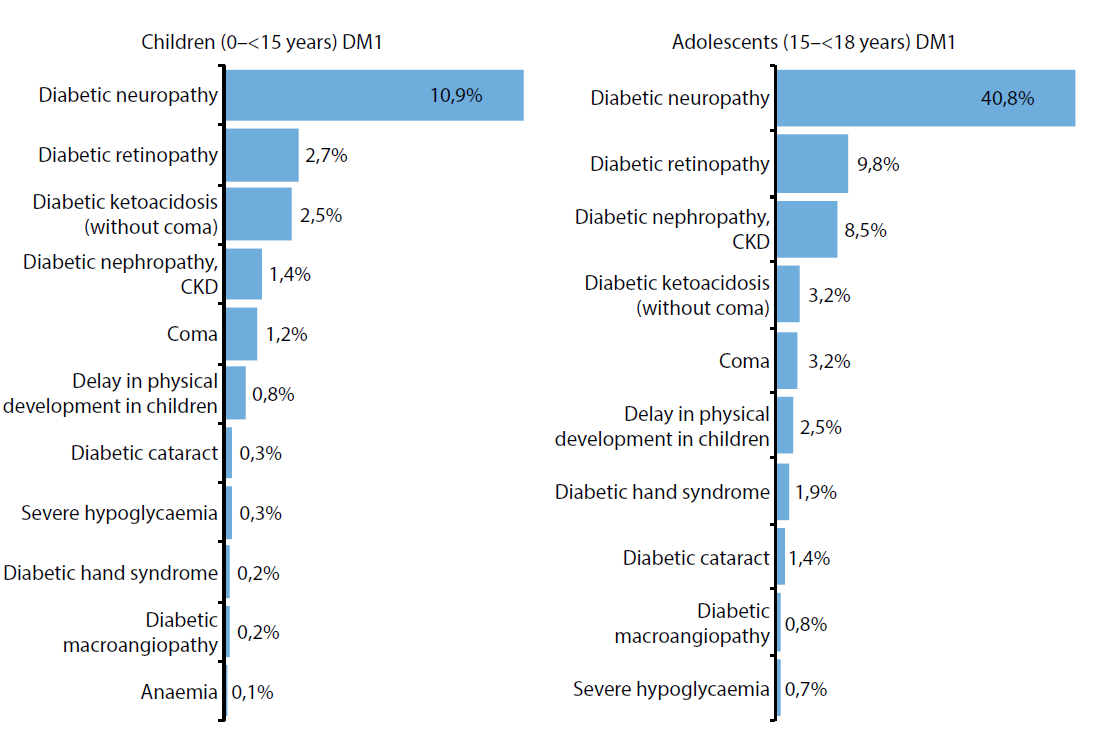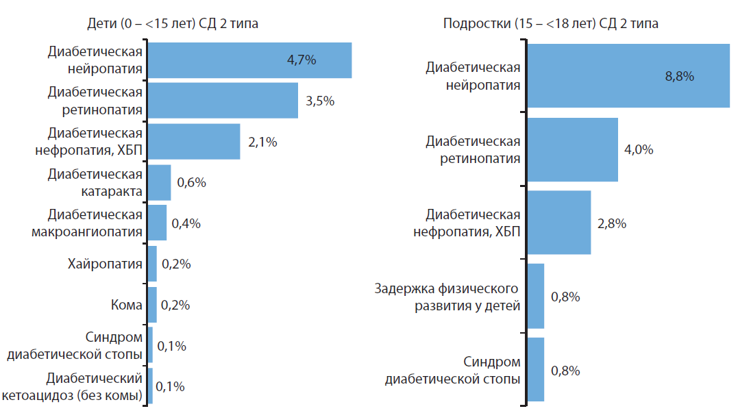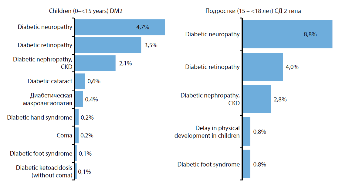 Таким образом, дети в возрасте 10 – <15 лет представляют собой когорту наиболее высокого риска, где наблюдается не только рост распространенности СД1, патогномоничного для данной возрастной группы, но и увеличение распространенности СД2. Эта опасная тенденция может являться следствием высокой распространенности избыточного веса и ожирения не только у взрослых, но и в детской группе пациентов. Существующие мировые данные подтверждают аналогичные тренды в других странах мира [2]. С учетом ожидаемой длительности СД при дебюте в детском возрасте риск развития хронических диабетических осложнений возрастает, что имеет все шансы стать серьезной проблемой здравоохранения, связанной с тяжелыми последствиями для здоровья пациентов и социального ущерба для общества в целом. Этот аспект эпидемии СД у детей требует наиболее пристального внимания органов здравоохранения.