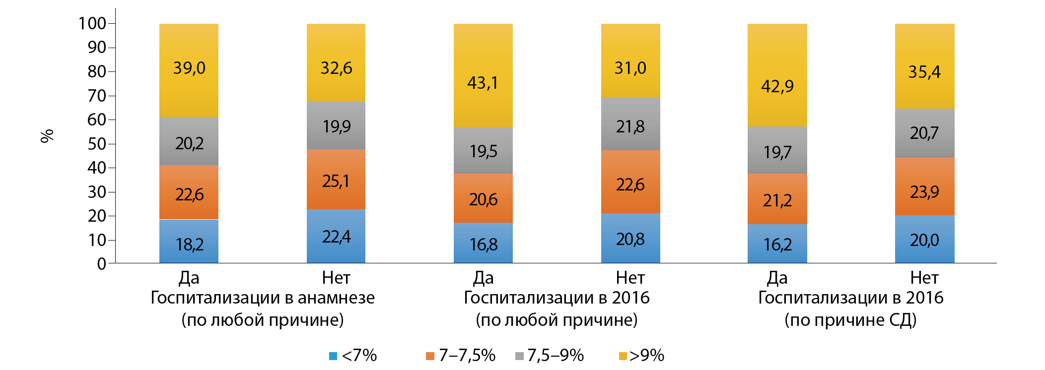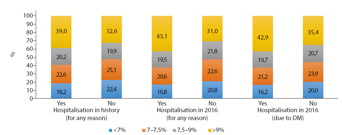 22. Рис. 16. Распределение пациентов детского и подросткового возраста по уровню HbA1c в зависимости от наличия и характера госпитализаций(81 регион РФ по данным онлайн-регистра). | |