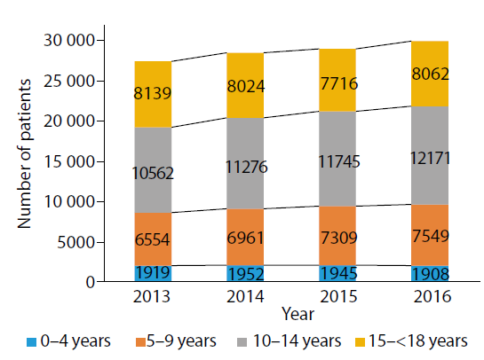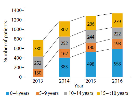 Рис. 2. Динамика количества пациентов с СД1 до 18 лет по возрастным группам, 2013–2016 гг., 81 регион РФ.