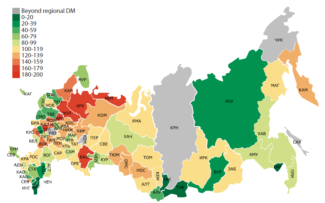Данные распространенности СД1/100 тыс. населения у лиц до 18 лет указывают на значительные географические различия показателя (рис. 5) – классический градиент «север-юг» и «запад-восток», с наибольшей распространенностью СД1 в северо-западных регионах РФ [3, 7, 9, 10].