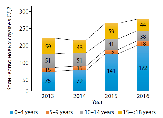 СД1: динамика распространенности СД1/100 тыс. населения указывает на преимущественный рост данного показателя среди детей – с 81,0 до 91,4/100 тыс. д.н. в 2013–2016 гг. при относительно стабильной распространенности СД1 у подростков – 212,8 против 209,5/100 тыс. п.н. соответственно (рис. 1). Распределение групп по возрасту отражает стабильный рост количества пациентов с СД1 среди лиц до 18 лет во всех возрастных группах: 5 – <10 лет, 10 – <15 лет и 15 – <18 лет, за исключением группы 0 – <5 года, где регистрировалось стабильное количество пациентов в течение 4 лет (рис. 2).