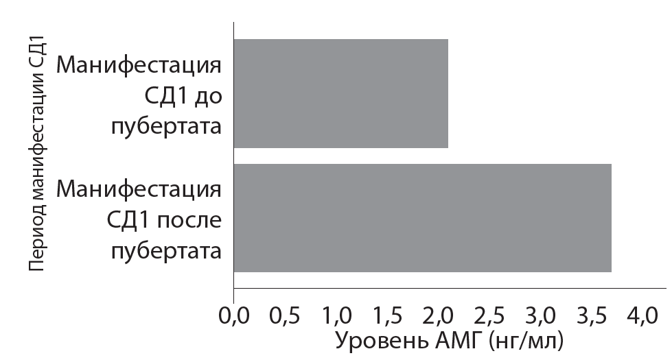 При анализе зависимости овариального резерва от сроков манифестации СД1 получены интересные результаты: при манифестации СД1 до пубертата овариальный резерв, оцененный по уровню АМГ, оказался ниже, чем у больных с манифестацией СД1 после пубертата (рис. 1).