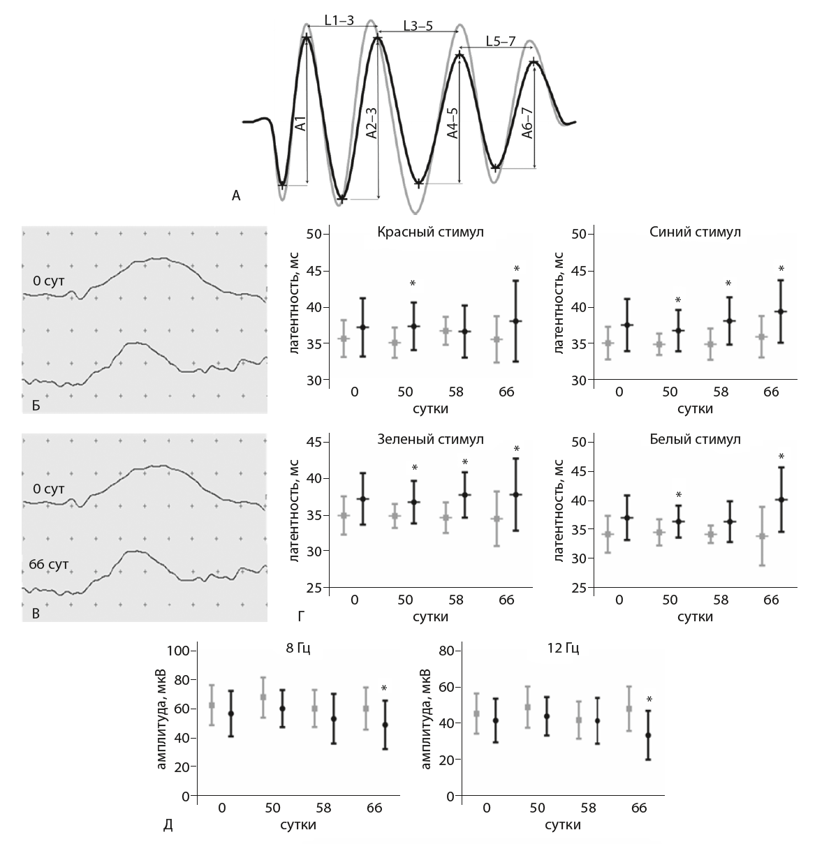 Более чувствительным оказался колбочковый ответ на различные цветовые стимулы (рис. 3Г). В частности, уже к 50-м суткам развития диабета наблюдалось статистически значимое увеличение латентности β-волны колбочкового ответа на все цветовые стимулы по сравнению с группой ЦБ в среднем на 5,4% (p<0,05). Латентность β-волн в ответ на синий и зеленый стимулы увеличилась в среднем на 8,5% по сравнению с группой ЦБ (p<0,05) на 58-е сутки. К 66-м суткам статистически значимые различия между латентностями β-волн между группами СД и ЦБ зафиксированы в ответ на любые цветовые стимулы. Латентности β-волн с увеличением срока наблюдения значительно не возрастали, но имелась тенденция к их увеличению по мере прогрессирования диабета. Амплитуда α-волны колбочкового ответа значимо не изменялась. СД привел к снижению амплитуды ритмического ответа при стимуляции с частотой 8 и 12 Гц на 66-е сутки в среднем на 25% (p<0,05) по сравнению с группой ЦБ (рис. 3Д).