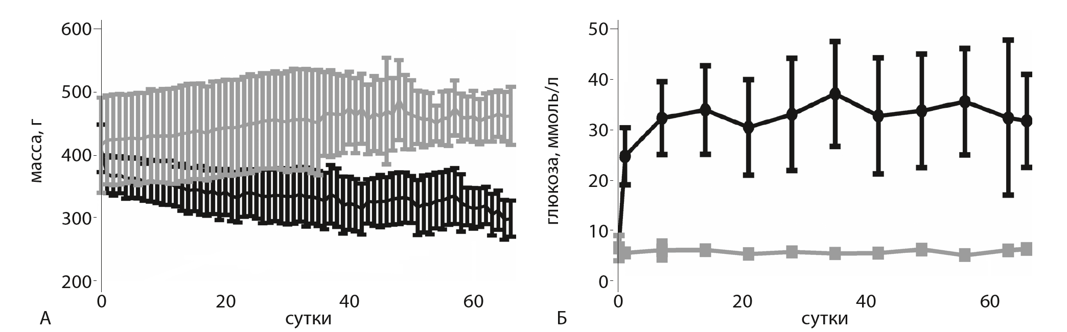 2. Fig. 1. A. Dynamics of animal mass after intraperitoneal injection of citrate buffer (CB group, gray graphs) or streptozotocin (SD group, black graphs). B. Dynamics of venous blood glucose from the tail vein after intraperitoneal injection of citrate buffer (CB group, gray graphs) or streptozotocin (SD group, black graphs).