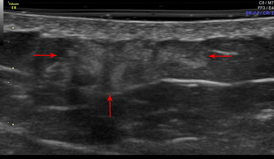 5. Рис. 1. Гиперэхогенный участок липогипертрофии в подкожной клетчатке передней брюшной стенки в зоне инъекций инсулина у больного сахарным диабетом. Серошкальное сканирование в B-режиме.