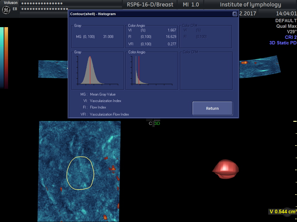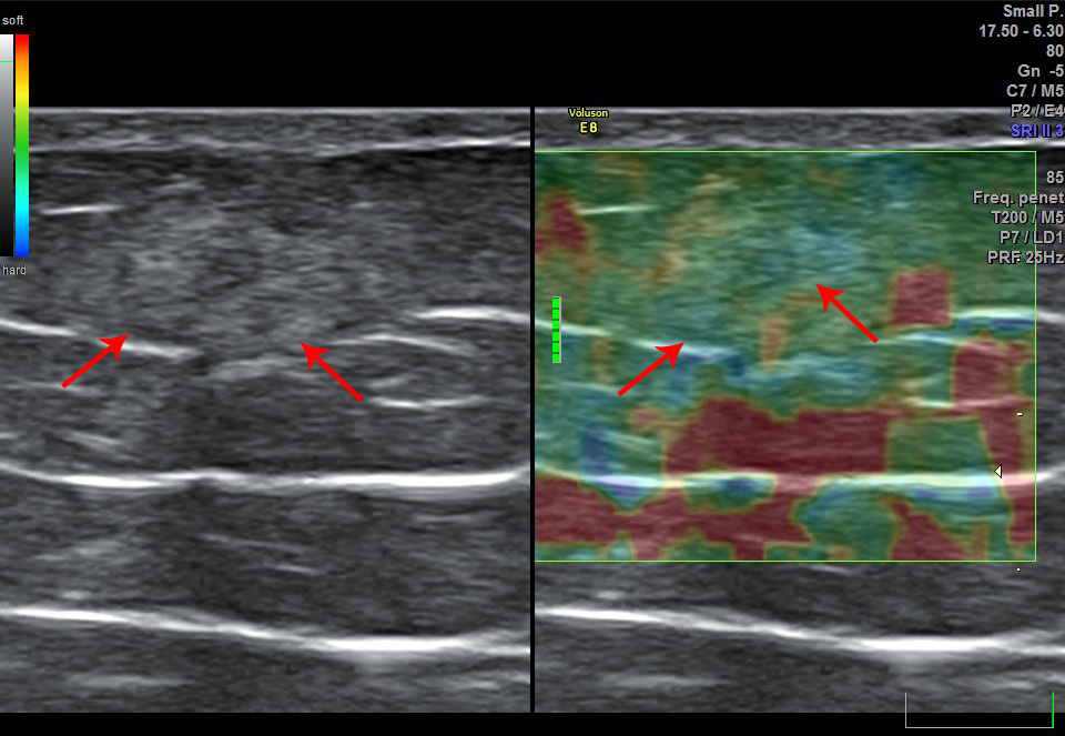 Ультрасонографические исследования выполнены на аппарате экспертного класса с возможностью автоматического трехмерного сканирования в реальном времени Voluson E8 Expert BT-12 (GE Healthcare, США), с использованием виртуального конвексного сканирования на линейном датчике 11L-D Linear Array Probe 4–10 МГц для исследования поверхностно расположенных органов и структур. Протокол предусматривал применение опций ELASTOGRAPHY ADVANCED 4D, OmniView+VCI, VOLUME CALCULATION II (VOCAL), а также программного обеспечения для полуавтоматического определения контуров структур и расчета их объема в режиме объемной реконструкции VOCAL ™ – Virtual Organ Computer Aided Analysis.