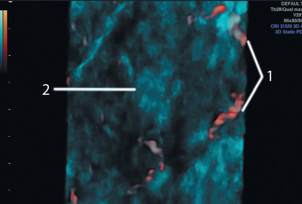 7. Fig. 3. Reconstruction of lipohypertrophy in the subcutaneous tissue of the anterior abdominal wall in the area of insulin injections in a patient with diabetes mellitus. 3D angio mode. 1 - blood vessels in the subcutaneous tissue in the mode of power doppler; 2 - hypovascular zone in the area of the lipohypertrophy region.
