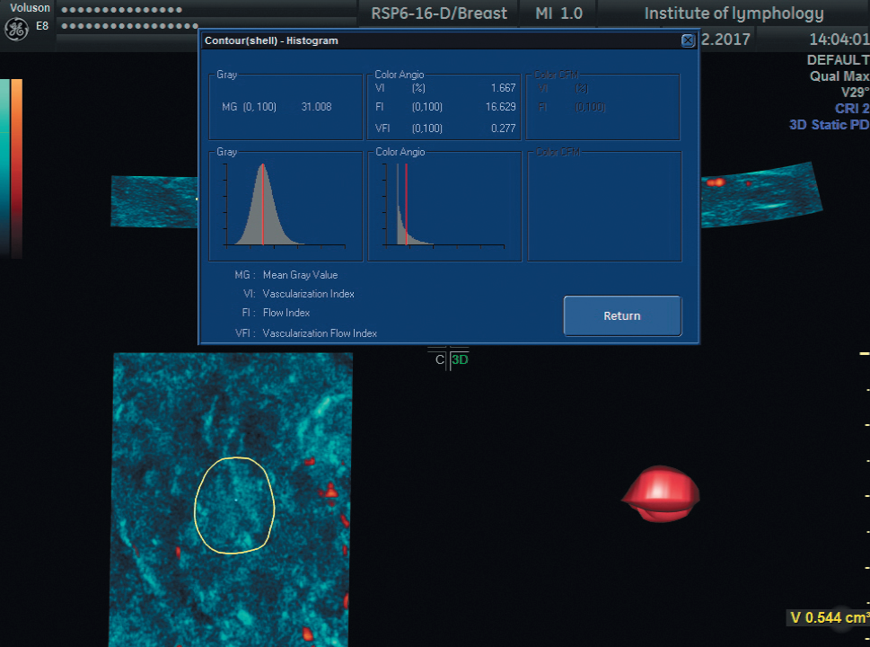 8. Fig. 4. Analysis of vascularization of lipohypertrophy in the subcutaneous tissue of the anterior abdominal wall in the area of insulin injections in a patient with diabetes mellitus. VOCAL ™ (Virtual Organ Computer Aided anaLysis) program. Above: vascular index values; bottom left: reconstruction of the lipo-hypertrophy section in 3D-angio mode; bottom right: volumetric reconstruction of the lipohypertrophy site.
