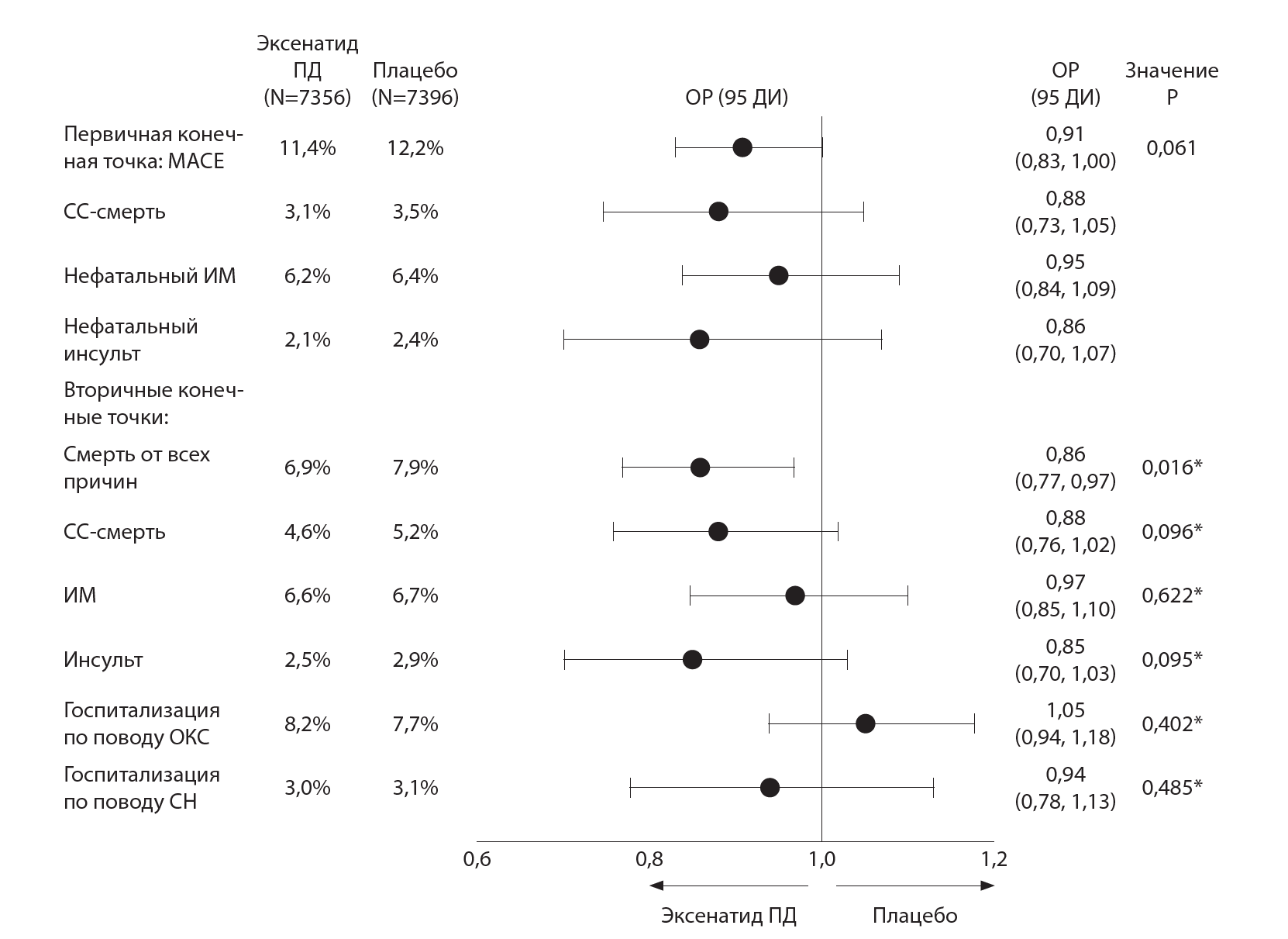 Примечания: *в связи с иерархическим анализом, несмотря на достижение статистической значимости по вторичной конечной точке «смерть от всех причин», полученные различия следует считать номинальными. ОКС – острый коронарный синдром; ДИ – доверительный интервал; СС – сердечно-сосудистый; Эксенатид ПД – эксенатид пролонгированного действия; СН – сердечная недостаточность; ОР – отношение рисков; MACE – крупные сердечно-сосудистые события, включающие комбинацию нефатальных инфаркта миокарда, инсульта, смерти вследствие сердечно-сосудистых причин; ИМ – инфаркт миокарда.