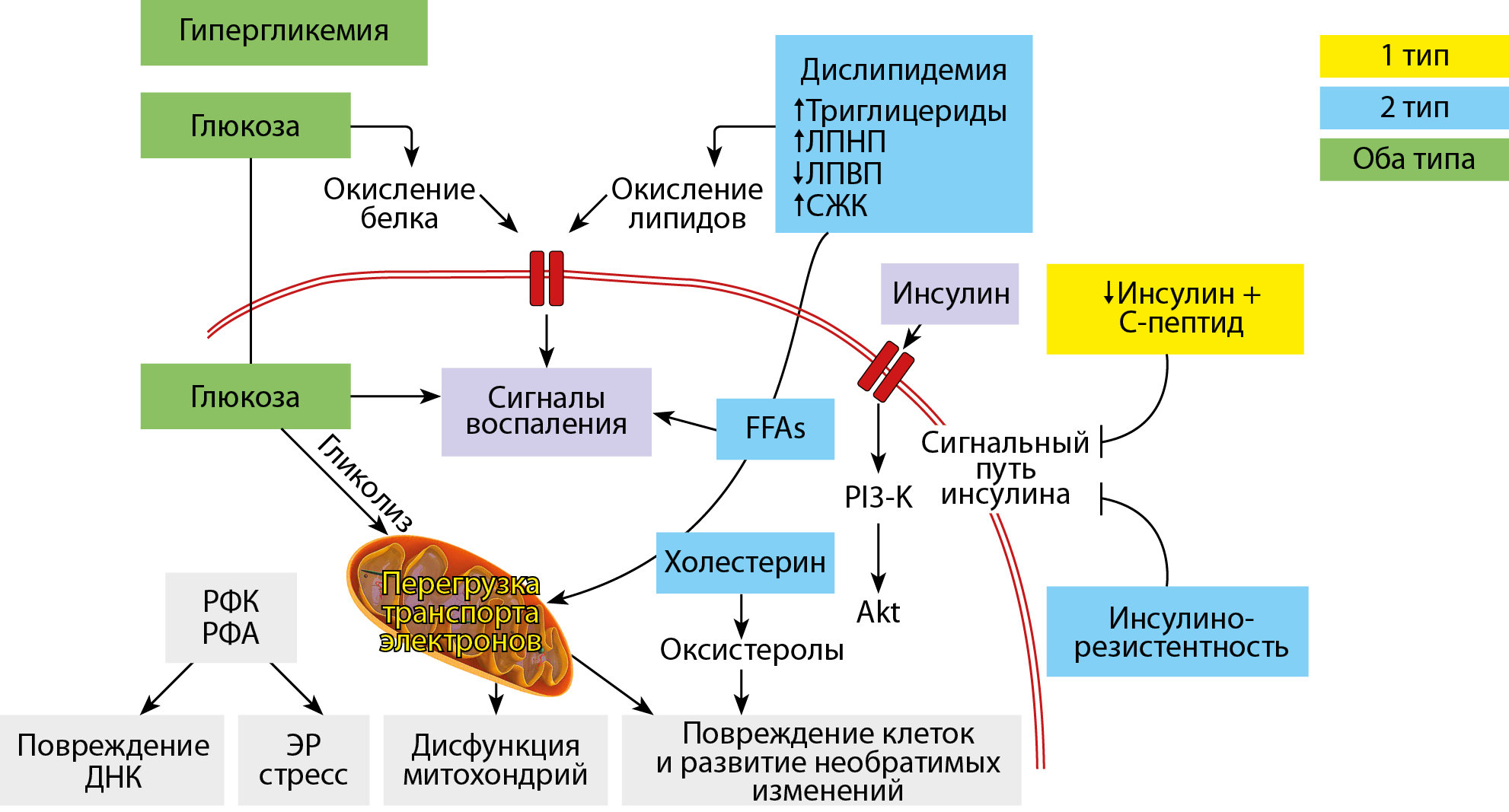 1. Рис. 1. Механизмы развития диабетической нейропатии. Факторы, характерные для сахарного диабета 1 типа (желтый цвет), сахарного диабета 2 типа (голубой цвет) и обоих типов заболевания (зеленый цвет), вызывают повреждение ДНК, эндоплазматический ретикулярный стресс, нарушение функции митохондрий, повреждение клеток с развитием необратимых изменений. Относительная важность различных патогенетических механизмов варьирует в зависимости от типа клеток, профиля заболевания и времени. ЭР – эндоплазматический ретикулум; СЖК – свободные жирные кислоты; PI3-К – фосфатидилинозитол-3-киназа; РФА – реактивные формы азота; РФК – реактивные формы кислорода. Адаптировано и воспроизведено из [11].