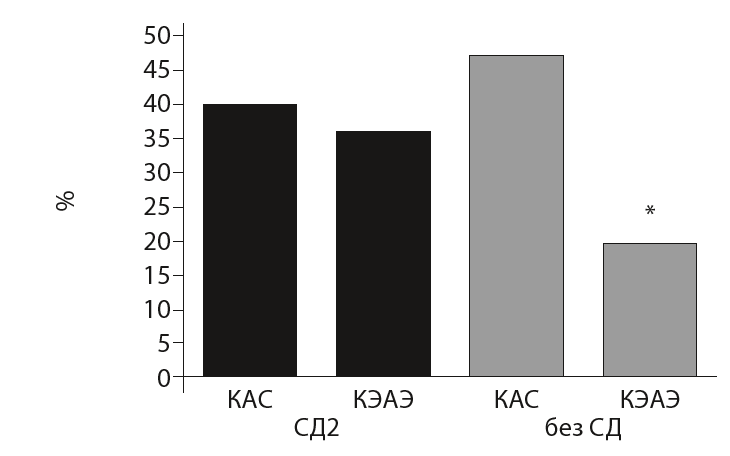 Results: In CAS, there were no statistically significant differences in the AIL frequency in patients with and without T2DM. AILs were found in 15 patients with T2DM (39.8%) and 29 patients without T2DM (46.8%, р = 0.24); three patients without T2DM were diagnosed with stroke. Of the 28 patients with T2DM who underwent CAE, 13 had AIL (46.4%); three had stroke (10.7%). In patients without T2DM, AILs were less prevalent in seven cases (19.4%, р = 0.012) and appeared asymptomatic. Following CAS, the baseline HbA1c levels were higher in patients with T2DM who developed AILs compared to those who did not develop AIL, 7.8% ± 1.4% vs 7.1 ± 1.1% (р = 0.0469). Negative impact of hyperglycaemia on the risk of cerebral ischaemia was observed in patients who underwent CAE, the baseline fasting plasma glucose level was 8.5 ± 1.9 mmol/l vs 7.0 ± 1.5 mmol/l in patients without AIL (р = 0.014). The baseline HbA1c levels in patients with and without AILs were 8.0% ± 1.7% and 6.9% ± 0.9% respectively (р = 0.023).