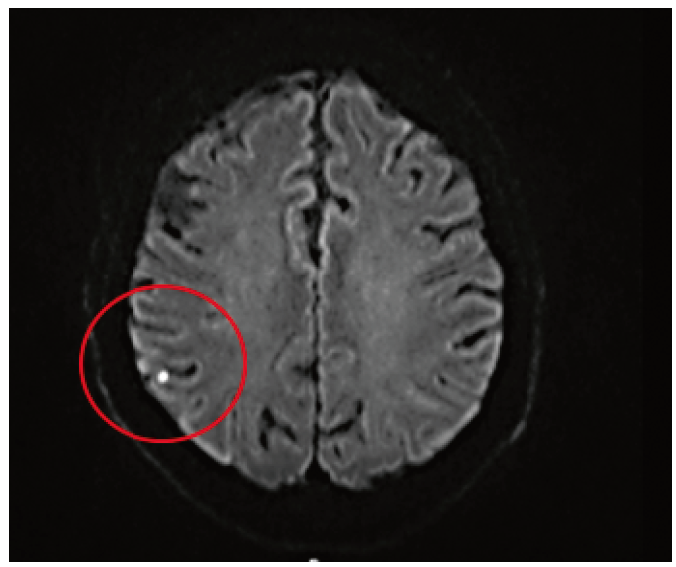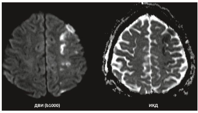 2. Fig. 2. Acute foci of ischemia in patient K., 66 years old, without diabetes mellitus, according to diffusion-weighted magnetic resonance imaging 24 hours after angioplasty with stenting in the cortex of the parietal lobe of the right cerebral hemisphere.