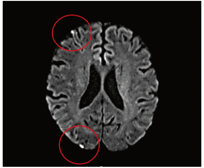 3. Fig. 3. Acute foci of ischemia in the cortical and subcortical substance of the frontal, parietal and temporal gyri (according to diffusion-weighted magnetic resonance imaging 24 hours after carotid endarterectomy) in patient S., 64 years old, with diabetes type 2 and perioperative stroke.
