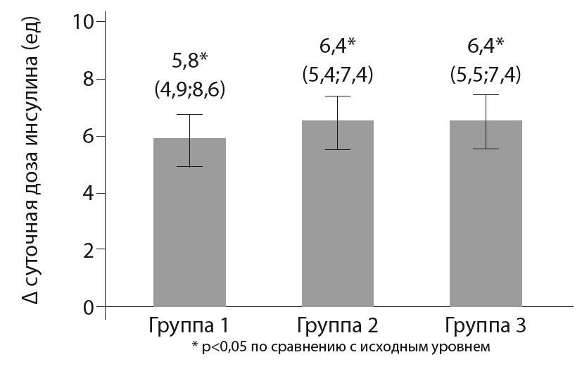Интересно, что улучшения показателей гликемического контроля в исследовании UKLS, проведенном в Великобритании, удалось достичь с одновременным снижением средней суточной дозы инсулина на 6 ед. Схожие результаты получены и в исследовании Grassi и соавт., где было отмечено снижение суточной дозы инсулина у пациентов, прошедших обучение правильной технике инсулиновых инъекций на 2,0 ед. (1,4–2,5 ед., 95% CI). В исследовании GIIIT, проведенном в Московской области, суточная доза инсулина повысилась приблизительно на 6 ед. во всех группах наблюдения (рис. 2).