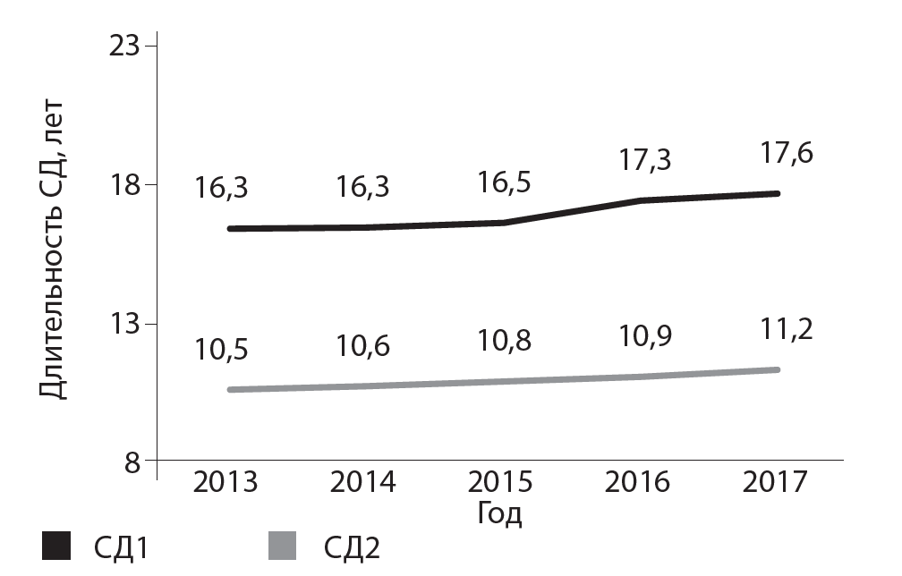 17. Рис. 11. Длительность заболевания до момента смерти при сахарном диабете 1 и 2 типов, 2013–2017 гг., 81 регион Российской Федерации. | |