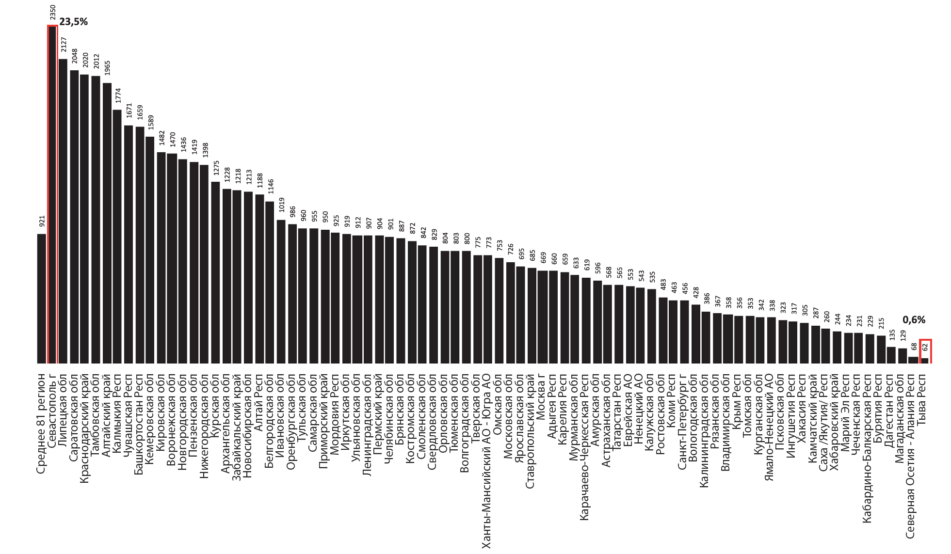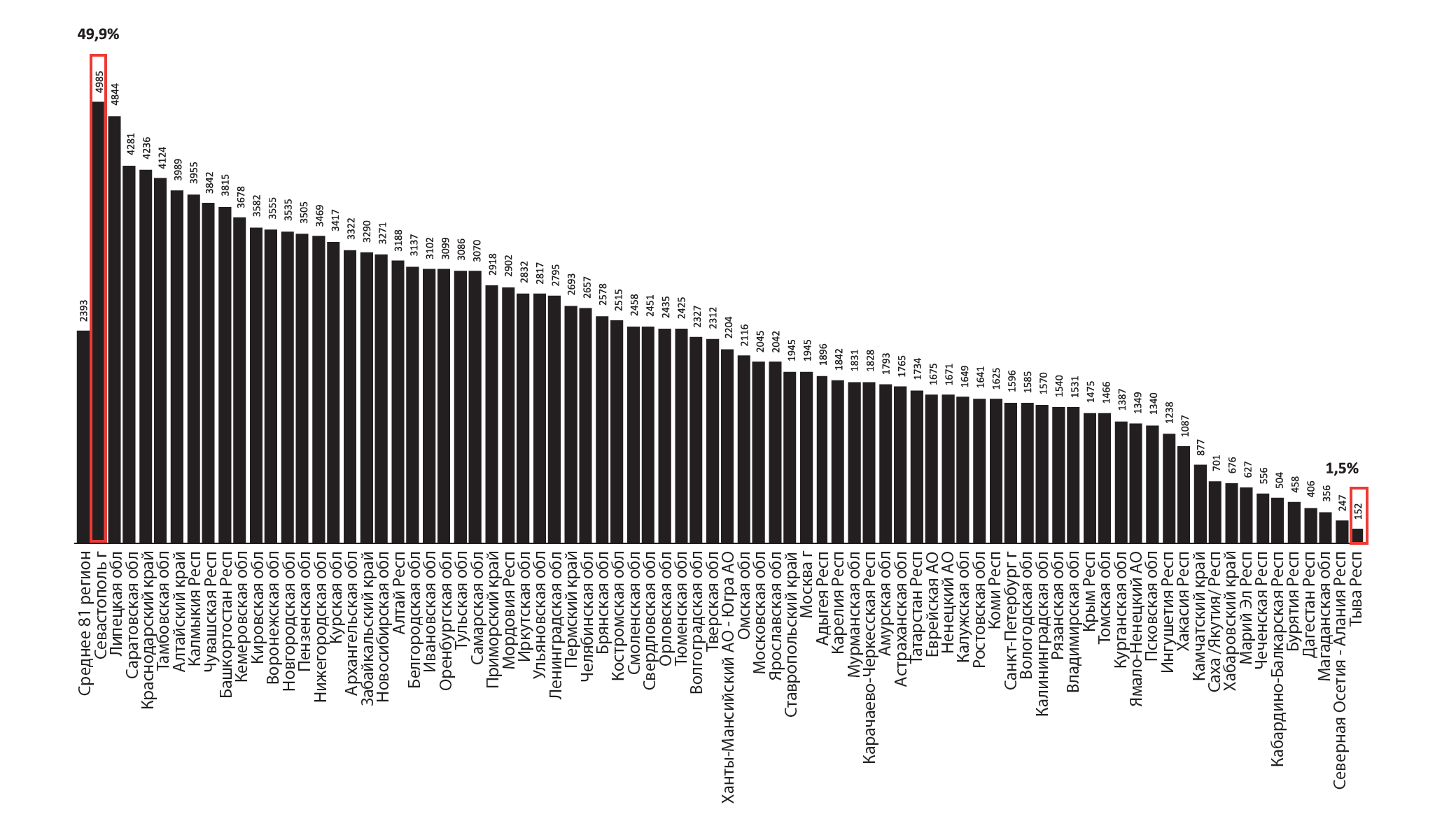 Рис. 2. Распространенность хронической болезни почек в регионах Росийской Федерации (на 10 тыс. взрослых пациентов с сахарным диабетом 2 типа), данные Федерального регистра сахарного диабета, 81 регион Российской Федерации, 2016 г.