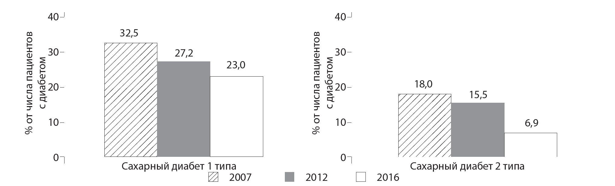 РЕЗУЛЬТАТЫ. В 2016 г. частота регистрации ХБП составила: СД1 – 23%, СД2 – 6,9%, с выраженными межрегиональными различиями от 1,5% до 49,9% и от 0,6% до 23,5% соответственно при СД1 и СД2. Распространенность ХБП в динамике 2013→2016 гг. составила при СД1: 2171,4→2303,0/10 000, СД2: 512,8→687,2/10 000 взрослых. Частота регистрации новых случаев ХБП возросла в 2 раза при СД1 (215,5 против 104,2/10 000 взрослых), в 3,7 раза – при СД2 (190,4 против 51,8/10 000 взрослых). Анализ распределения по стадиям указывает на улучшение диагностики осложнения. В структуре ХБП выявлено увеличение доли пациентов с низким и умеренным риском сердечно-сосудистых событий и терминальной почечной недостаточности по критериям KDIGO (начальные стадии ХБП С1–2, А1–2): СД1 12,0%→46,8%; СД2 10,0%→50,4%. Доля пациентов с очень высоким риском (стадии С–5, А2–3) уменьшилась: СД1 13,4%→6,7%, СД2 11,3→4,4%. Установлена зависимость распространенности ХБП от длительности диагноза СД. При СД1 <5 лет ХБП развивалась у 5,1% пациентов, при СД1 <30 лет – у 48,0%; СД2: 3,5% и 20,3% соответственно. Средний возраст дебюта ХБП у лиц с СД1 увеличился на 4,3 года (36,1→40,4) и 2,4 года при СД2 (64,4→66,8 лет), длительность СД до момента диагностики ХБП увеличилась: СД1 – 11,8→14,2 лет, СД 2 – 7,6→8,2 лет.