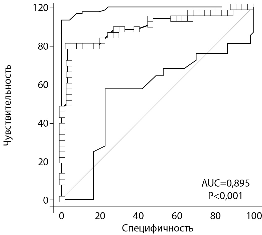 С целью определения отрезной точки (cut-off point) диагностики КИНК с использованием оценки ЛПССК был проведен ROC-анализ (построение кривой операционной характеристики) с определением чувствительности и специфичности метода. Статистическая обработка данных проводилась при помощи программы MedCalc statistical software. В качестве оптимальной отрезной точки был принят уровень показателя, которому соответствовало максимальное значение суммы чувствительности (пропорция истинно положительных результатов, подтвержденных тестируемым методом, по отношению к золотому стандарту) и специфичности метода (пропорция истинно отрицательных результатов, подтвержденных тестируемым методом, по отношению к золотому стандарту), полученных в ходе ROC-анализа [12].