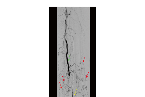 Рис. 8. Ангиограмма артерий нижней конечности пациента с сахарным диабетом и критической ишемией конечности. Зеленой стрелкой указан нормальный кровоток в поверхностной бедренной артерии, красными стрелками указаны коллатеральные сосуды, желтой – кровоток в дистальном сегменте артерии.