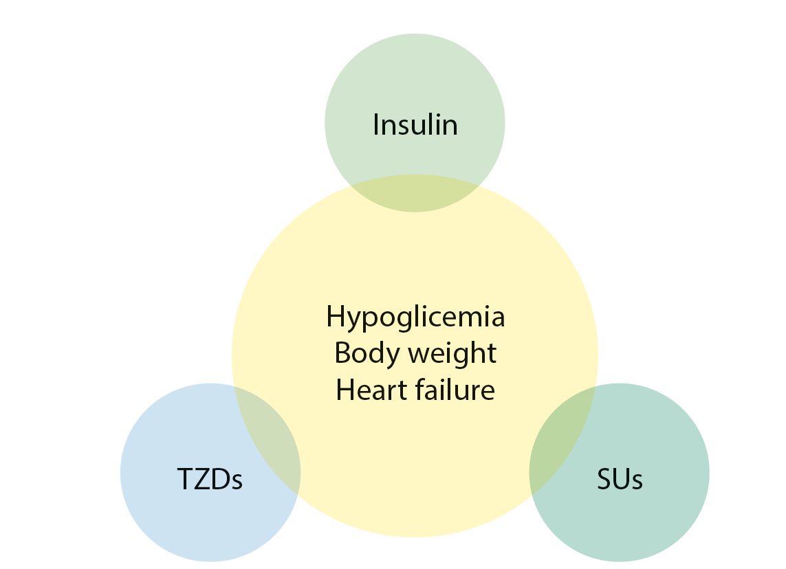 5. Fig. 1. The most prominent adverse effects observed in patients treated with insulin, thiazolidinediones (TZDs) and sulphonylureas (SUs): hypoglycemia, increase in body weight, and heart failure. | |