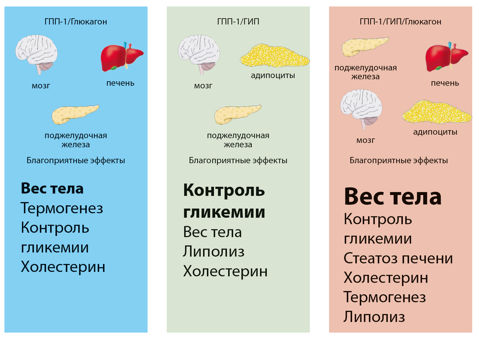 В 2013 г. был разработан ко-агонист ГПП-1/ГИП. Включение ГИП было обусловлено желаемым увеличением инсулинотропных эффектов ГПП-1, в то время как снижение аппетита на фоне ГПП-1 должно было нейтрализовать возможное обезогенное действие, ассоциированное с ГИП [55]. И наконец, в 2015 и в 2017 гг. были созданы два триагониста ГПП-1/ГИП/глюкагон [56, 57]. Все эти молекулы продемонстрировали эффективность в снижении массы тела и гликемии у мышей с алиментарным и генетически обусловленным ожирением, а также у приматов и людей [54].