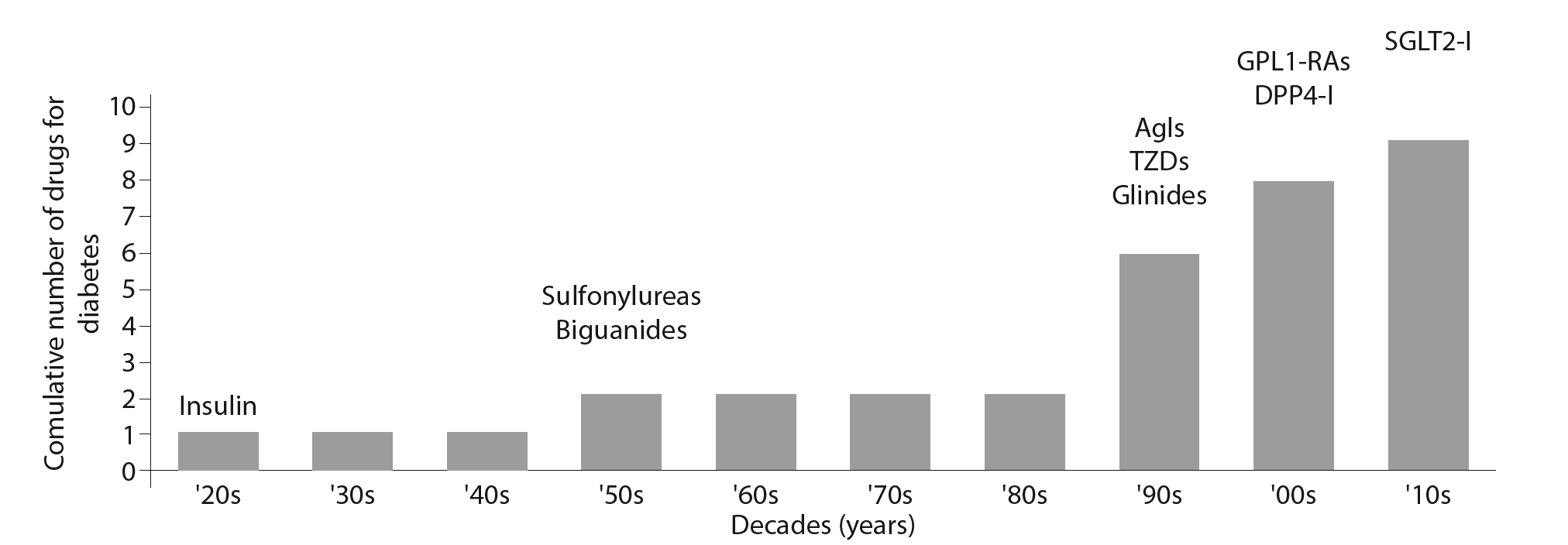 По сравнению с предыдущими схемами лечения, в настоящее время мы располагаем препаратами, действующими на более определенные механизмы, обусловливающие развитие диабетической гипергликемии. С годами мы переместились от случайного открытия сахароснижающих свойств препаратов, таких как производные сульфонилмочевины и бигуаниды, к тому времени, когда разработка лекарств для лечения диабета чаще берет начало из более глубокого понимания патофизиологии нарушенного гомеостаза глюкозы. Поэтому применение сахароснижающих препаратов в современном мире не должно просто опираться на их эмпирическую эффективность, но также разумно основываться на коррекции или улучшении определенных механизмов.