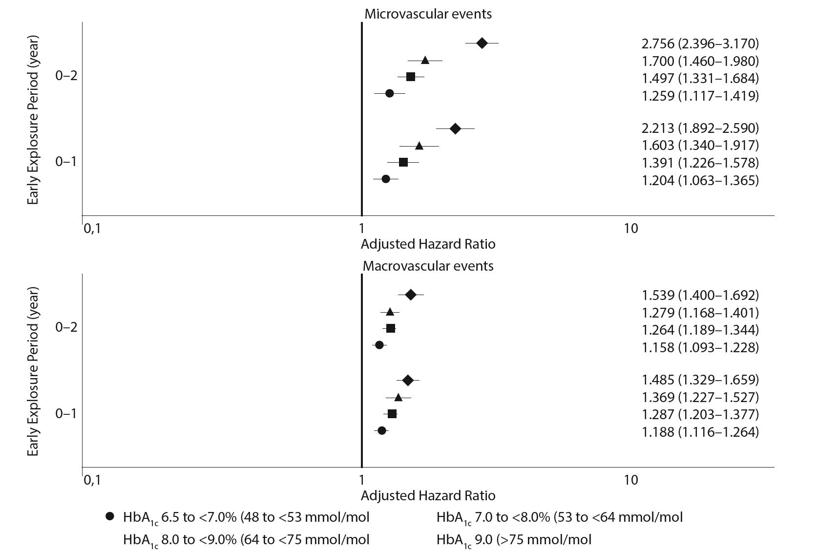 5. Fig. 2. Hazard ratios /HR) comparing microvascular (upper panel) and macrovascular (lower panel) event rates for various HbA1c at first year and first 2 years after diagnosis and levels as compared with an HbA1c <6.5% (<48 mmol/mol) for the same exposure periods. HRs adjusted for year of diagnosis, age at diagnosis, sex, race/ethnicity, BMI, systolic and diastolic blood pressure, total cholesterol, HDL cholesterol, smoking status, HbA1c after each early exposure period, and comorbidity (Adapted from ref. 4) | |
