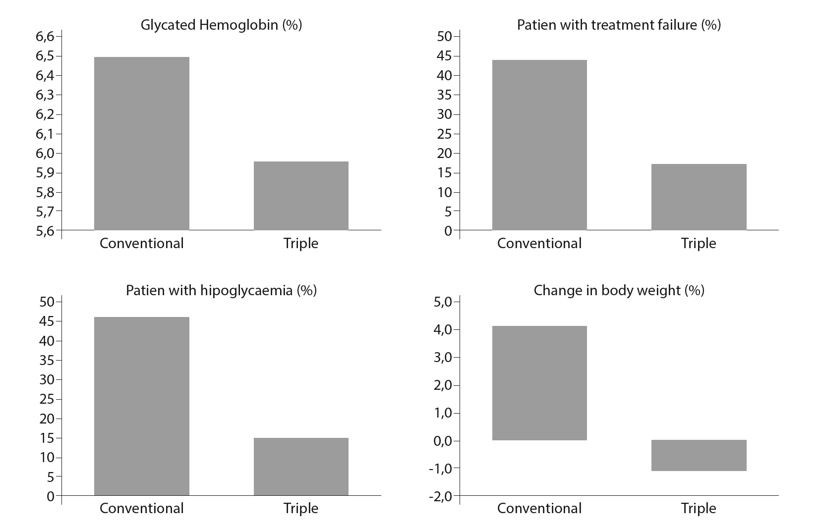 6. Fig. 3. Glycated hemoglobin (HbA1c, %), patients with treatment failure (%), patients with hypoglycemia (%) and change in body weight from baseline after 2-year treatment with conventional (initial escalating dose of metformin followed by sequential addition of sulfonylurea and glargine insulin) or triple (metformin/pioglitazone/exenatide) therapy. Treatment failure: HbA1c >6.5% on two consecutive visits (3 months) despite maximum anti-hyperglycemic therapy. Hypoglycemia: blood glucose <3.3 mmol/l (60mg/dl) or symptoms. Basal HbA1c 8.6%, Basal body weight 101 kg. | |