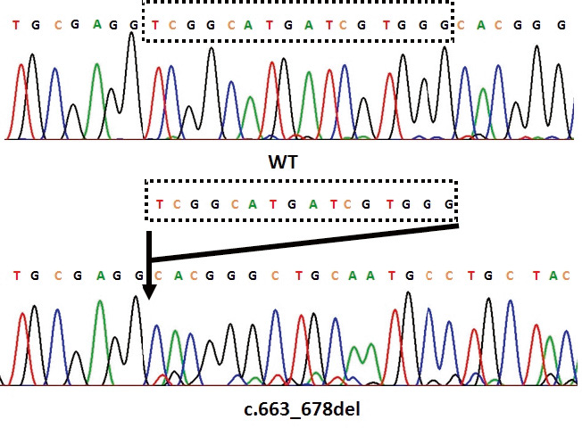 4. Fig. 4. Chromatogram with the results of sequencing of splicing products obtained in vitro using the technology of "minigena" [5]. WT is a fragment of the wild-type transcript sequence; c663_678del - a fragment of a transcript with a deletion of 16 base pairs as a result of the synonymous variant c.666C> G. | |
